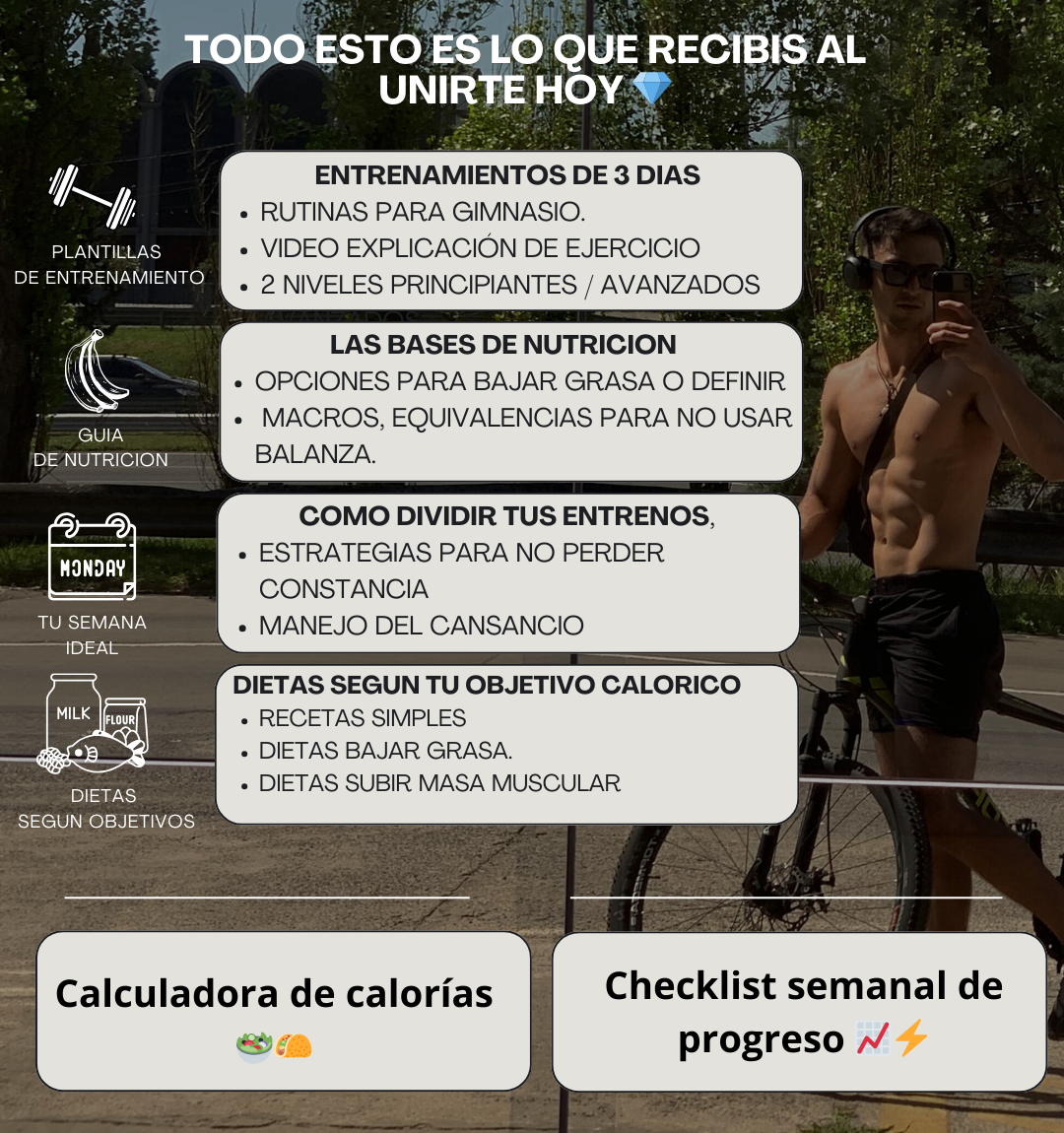 Incluye plan de entrenamiento estructurado, guía de hábitos y estrategias de adherencia, para que avances paso a paso sin perder constancia ni energía.